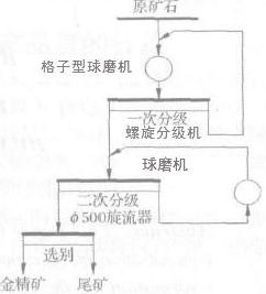通過對當(dāng)時生產(chǎn)工藝流程的考察與計算,發(fā)現(xiàn)制約提高生產(chǎn)處理能力的瓶頸主要在磨礦和選別作業(yè)。破碎和脫水只須作適當(dāng)調(diào)整即可滿足改造后的工藝需求。